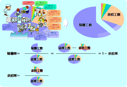 | 1.稼働率と余裕率 稼働率は、作業者に与えられた工数に対して、付加価値を生む作業に使われた工数がどのくらいあるかを示す指標です。もちろん高い方が望ましいのは言うまでもありません。 一般には次のような就業工数に対する実際工数の比で表します。 |