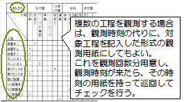 ◇ワークサンプリングは、統計のサンプリング(抜取り)の考え方を応用した方法です。あらかじめ観測時刻を設定し作業内容をリストアップしておき、その時刻に観測対象が何をしているかをチェックして記録します。瞬間観測法とも言います。◇長所 ・他の仕事をしながら観測することが可能です。 ・一度に多くの観測対象を扱うことができます。 ◇短所 ・サンプル数が少ないとデータが信頼できないため、観測目的によっては数日を要することもあります。 |