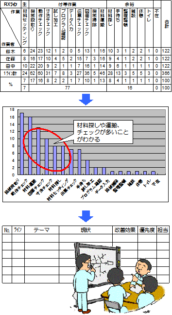 | 観測中に気付いた問題点や作業者工程分析の結果も一緒にまとめて、問題点一覧表を作ります。 |