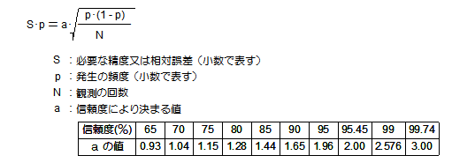 | 例)稼働率を求めようとしてワークサンプリングの予備調査を実施したところ、 次のような結果が出ました。 観測回数 100 稼働 75 余裕 25 p=0.75、S=±0.05、信頼度95%とすると、上の表から a=1.96≒2 を得ます。 上の式を変形して計算すると、必要な観測回数 N は |