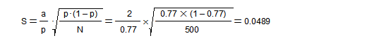 | よって、±4.9%は期待精度が満足されますから、観測回数はこれで十分です。 すなわち、稼働率は77±4.9%の範囲にあり、その真の値は信頼度95%で、絶対誤差Sp=3.8% により、73.2〜80.8%の間にあるということができます。 |