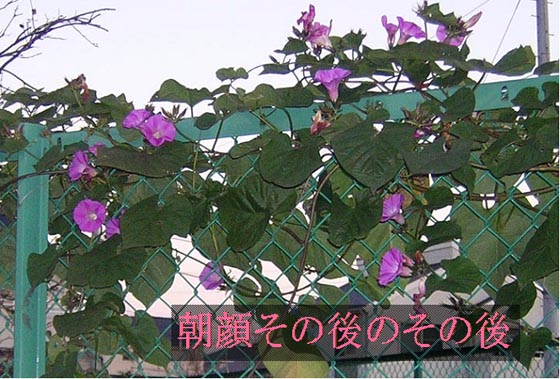 あの朝顔。 葉に青さは残るものの、やっぱり年越しはムリだった。でも、短い間に色々なことを考えさせてくれた花ではあった。 そう言えば、隣りにあった家がなくなって、いつの間にかさら地になっている。こんな取るに足らない草花でも、また来年生えるであろう命のゆったりとした時間と比べて、人の世のなんとめまぐるしく移り変わっていくことか。この切なさを、古の人は無常観と呼んだのだろう・・・。 これで、朝顔シリーズはホントにおしまーい。 |