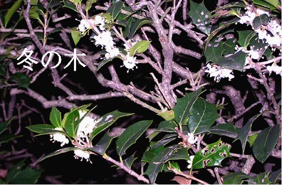 小さなトンネルを抜けて東名高速をくぐると、左に高速に沿って隘路が通っている。少し急な坂になっていて、ここをせっせと上っていくと、いい汗をかく。すると、かすかに・・・ほんのかすかに良い香りがした。ここはいつも通る道なのに、こんな香りはついぞ感じたことがない。どこから流れてくるんだろうとキョロキョロしていると、犬を連れて坂を下りてくるおじさんに変な目でジロジロ見られてしまった。 怪しい人物と思われてはたまらないので、カメラを取り出して植木を撮るような振りをしたら、そのファインダーに写った白い花が香りの元なのだった。 葉の形で、それがヒイラギだとすぐわかる。後で調べてみたら、モクセイと同じ仲間。道理で香りが良いはずだ。小さな白い花の付き方もよく似ている。 ヒイラギ。木扁に冬と書く、この時季の代表的な花と言ってよいだろう。クリスマスの飾りに使う赤い実のヒイラギはセイヨウヒイラギという別種。そんなウンチクはちょっと調べれば誰でも語れるから、ここではそれ以上深追いはしないでおこう。 冬の香りの初体験がとてもいい気分だ。 |