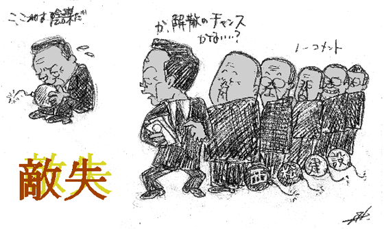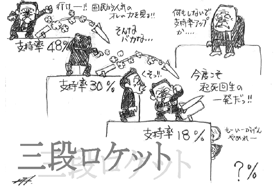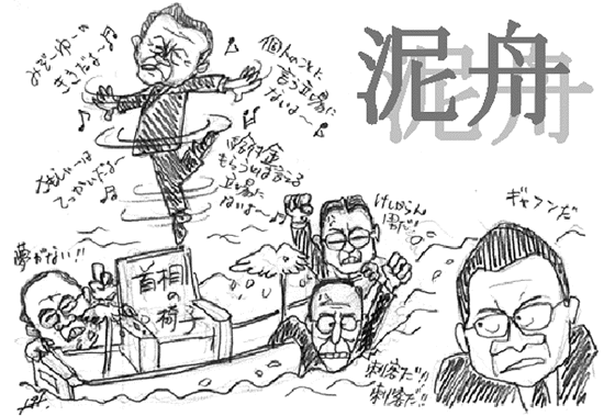 例えば、これで一番得するのはだれか?と読んで推理する人もいれば、与党の怪しげな議員はどうなのかと不思議に思う人もいて、視聴率はうなぎのぼり。黒幕はメディアで、どこかのディレクターがシナリオを書いているかのようだ。でも、勘違いするなよ。面白いから見ているんじゃないんだぞ。本当に国全体が沈没しかねないときに、何やってるんだ、この国の政治は? テレビのバラエティ番組のような政治しか行われない国で、毎日苦しい生活を送らなければならない国民は、なんて不幸なんだろうと、また同じことを思う一日が過ぎていく。 |