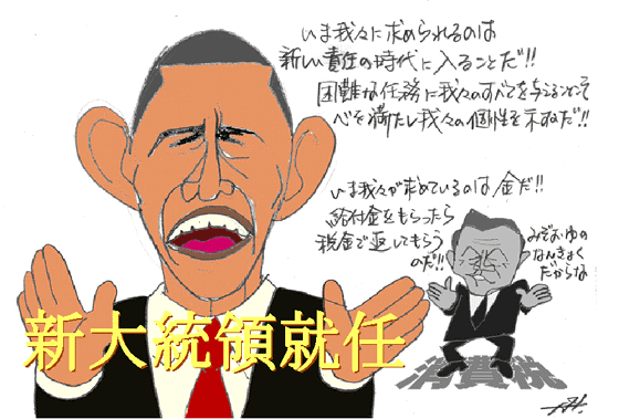 オバーマ氏がアメリカの新しい大統領に就任した。18分余の就任演説の中で語られているのは、人の力の素晴らしさ。違いを乗り越えて人々が協力することが危機を克服する原動力であるということだった。経済の専門家は過度の期待は禁物だと警鐘を鳴らし、敵対する国々は相変わらず冷ややかである。確かに、すぐに劇的な変化を求めるのは酷な話だろう。 しかし、貴重な金をばらまき、金持ちと官僚を擁護し、国民には増税を企て、口を開けば100年に1度の危機と不況を煽り、自身は最高権力者を満喫する以外なーんにもやってくれない、どこかの国のエライ人よりは、ずっとずーっと期待が持てるよなぁ。 |