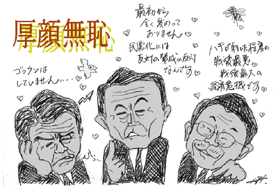 次の選挙で負けることは、指摘されなくてもわかっている。どうせ負けるんだから、今のうちに貰えるものは貰っておくように。歳費、献金、政党助成金、エトセトラ。失職してしまうと手に入らなくなるから、選挙はギリギリ一杯まで先送り。なんたって、優秀な官僚が味方に付いているんだ。政策なんて、天下りと渡りを認めて奴らに任しておけば、適当にごまかしてくれるさ。支持率が下がれば下がるほど、今すぐ選挙をやろうなんて言うバカな奴がいるわけがない。なんやかんや騒いでも、今、造反するだけの度胸のある奴が与党にいると思うか?もう党内はそういう方針で一致しているんだ。野党もわかっちゃいねぇな。 その後、この党が分裂しようがぶっ壊れようが知ったこっちゃないんだ。国民なんて少し時間が経てば昔のことなんかコロッと忘れるからな。どうせ次の政権は消費税を上げざるを得なくなってつぶれる。つまり、次の次の選挙ではほとぼりも冷めて、新党立ち上げてみんなで政界復帰だ。ちょろいもんさ。 なに?国民は苦しみにあえいでいる?ンなこと知るか。給付金の評判が悪かろうが、実際に手にすりゃ泣いて喜ぶ哀れな貧乏人どもが。その後野垂れ死にしようとどうなろうとオレの知ったことか。 だぁから言ってるだろ。最初からぜぇんぜんブレてないよ、オレぁ。 うーん。今朝はやけに夢見が悪くて頭が痛い。インフルエンザか??? |