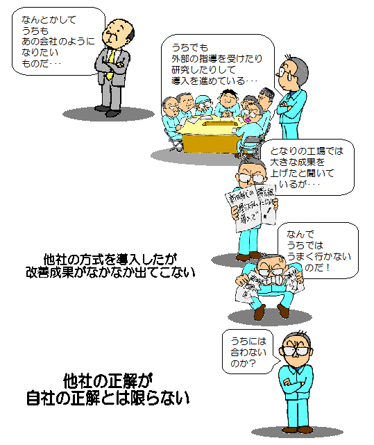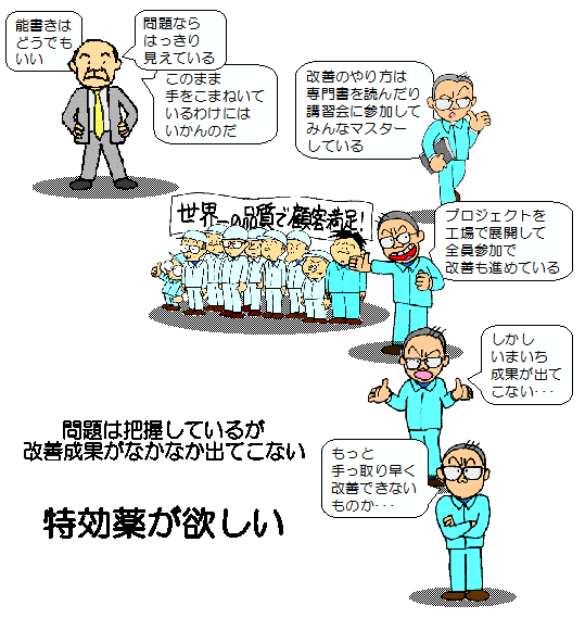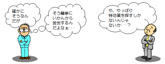 | そのうち、業績の良い他の会社のやり方が特効薬に見えてきて、 とりあえず、同じやり方を導入してみようということになります。 もちろん、それで成果が出れば言うことはありません。 問題を正しく認識し、なんとか解決しようという意欲がある限り、 いろいろ挑戦することは決してムダなことではありません。 |