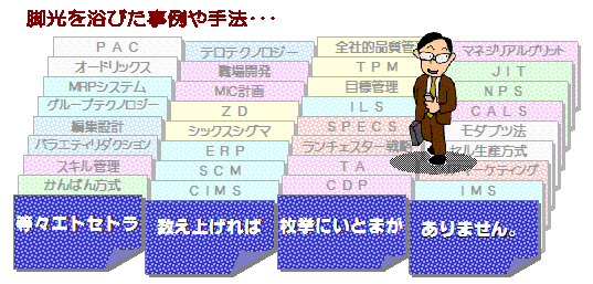 | 古今東西、さまざまな経営手法、管理技法が開発されて 多くの企業に導入されています。 そのほとんどは、現在では特に驚くほど目新しいものではなく、 基本的な経営・管理技術の応用です。 |