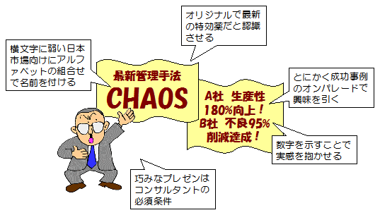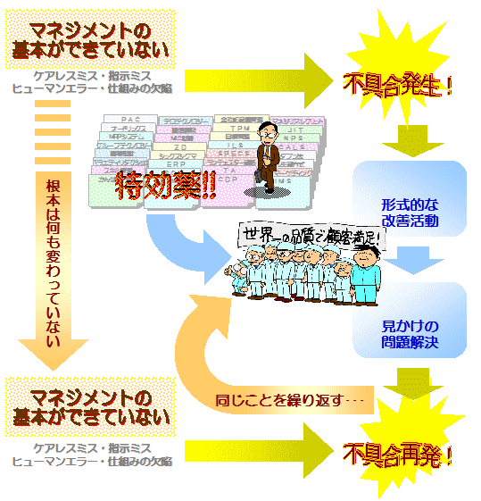 | こういうサイクルはいつまでも市場が消滅しないので、特効薬を売り込む側にとっては悪くない状況と言えるかもしれません。しかし、何回も失敗を繰返していれば、だんだん社員のモチベーションが低くなってきて、どんなに鈍感な経営者でも改善活動そのものに不信感を持ちはじめます。こうなると、いくら過去の華やかな成功事例を引き合いに出しても、なかなか売り込みには成功しなくなってきます。 ところがどっこい。 それでは特効薬なんてないことに気付いたのかというと、相変わらず特効薬を求めるスタンスは変わらない。同じ中身で看板だけ変えた手法が、マスコミなどで取り上げられるとすぐに飛びついて、また同じ失敗を繰返します。 このこと自体がすでにマネジメント欠如です。 |