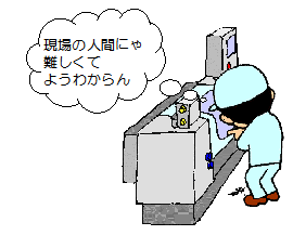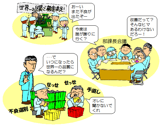 | 珍しくもない光景ですか・・・ でも、上のマンガを見て、なんか変だと思いませんか? 忙しい忙しいと言いながら、ボーっと突っ立っている奴の多いこと・・・ 何かあると会議ばっかり開いていて、この先どうするんだろう・・・ 選別とか手直しって、本来はやらなくてもいい作業じゃないかな・・・ |