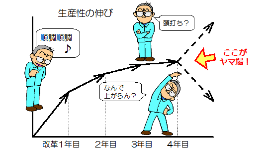 | 真のロス(=品質)が顕在化してくるからです。 改善が真に成功するか否か、ここが最大のヤマ場です。 |