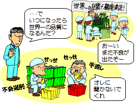 | 後工程はお客様のつもりで不良を流さないようにしなさいという意味です。 精神論的だという批判もありますが、 0や1のような低いレベルの職場では、 このようなモラルすら疲弊していることが多いので、大切な課題です。 |