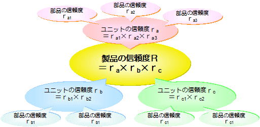 | つまり、 製品の信頼度は、 製品を構成する各部品の信頼度を掛けた値によって 決まってくるというものです。 |