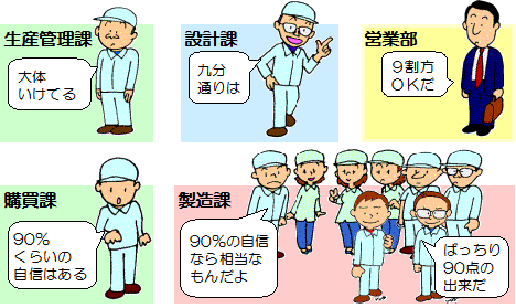| 果たして太鼓判が押せるでしょうか? 9割方OKでは品質は保証できません。 品質保証は 一人ひとりが確実に責任を果たし、 仕事の結果に太鼓判を押すことです。 決して品質保証部だけの責任では ありません。 |
