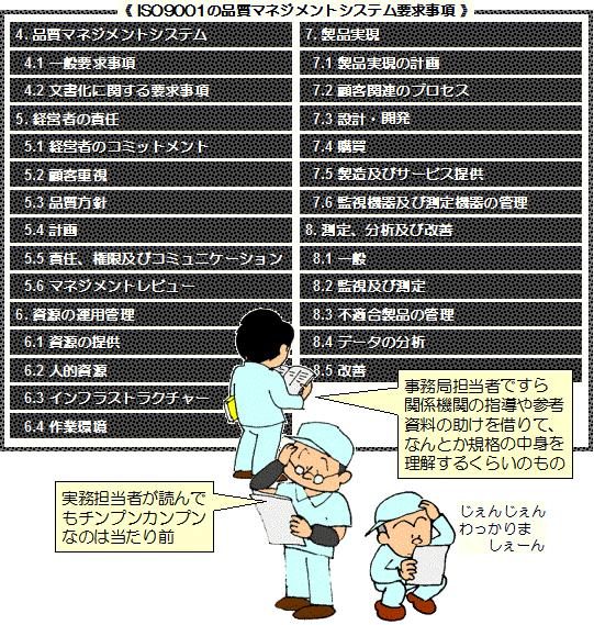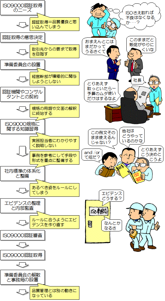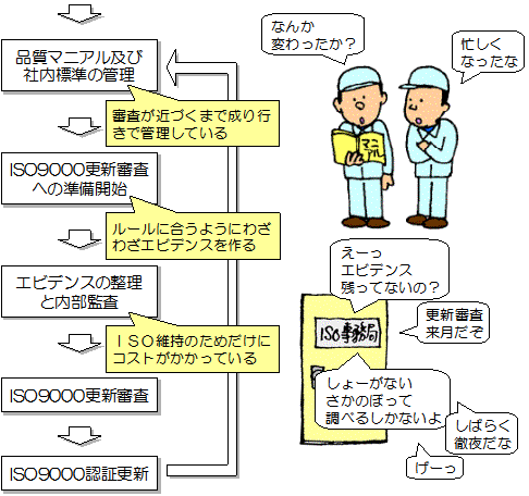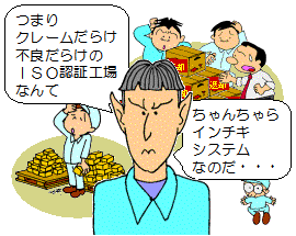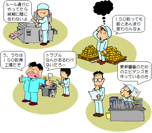 苦労してISO9000の認証を取ったのに、品質が良く なった実感が全くなく、認証更新が重荷になっている。 |