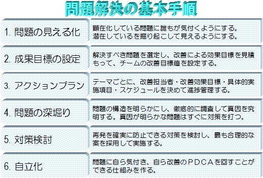 | 問題解決のやり方というのはいろいろな考え方・アプローチがありますが、 シンプルに下のような基本手順に沿って、実戦のポイントをお話しします。 |