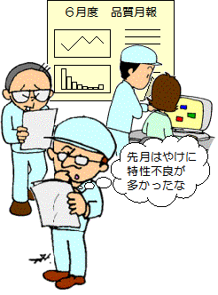 | なんとかこの統計データを品質向上に役に立つようにしたいと、 品質保証部の女性が一念発起、改善活動に参加してきました。 |