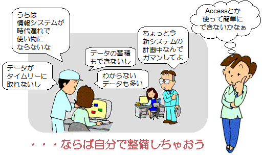 | 当時、生産管理システムの更新時期にあって、 その方面のデータも不安定な中で、 Accessという少々とっつきにくい汎用ソフトを使いこなして、 よくここまで作り上げたなあと感心しています。 |