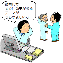 | 改善活動の中でテーマアップするなら、 余程の問題意識と忍耐力がないと、 活動を持続すること自体 なかなか容易ではありません。 現実的には、通常業務の一環とするか、 準備室のような臨時の専門組織を作って 進める方が賢明です。 |