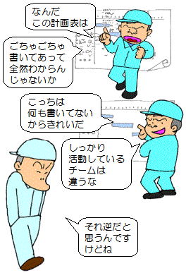 | ラインパトロールをして各チームの実施計画をのぞいて見ると、 活発に改善活動を進めているかどうかが大体わかります。 |