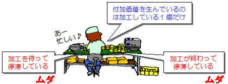 | しかし、単に物をまとめて作るやり方は、大きなムダができるのでいただけません。 ロット生産と呼ばれるこのやり方は、作業者はひたすら手を動かしているのでムダがないと信じ込んでいますが、品物に注目すると加工中の1個以外はすべて停滞しているムダな状態です。 |