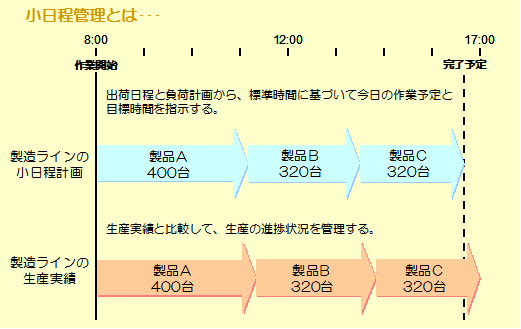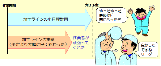 | 生産管理部というのは、生産のPDCAを回していく、まさに工場の司令塔でなければなりません。 受注した製品を効率良く生産し納期通りに出荷するために、生産能力や日程、在庫などをコントロールするのが生産管理です。そのために生産計画を作成し進捗状況をチェックして、問題が起こらないようにアクションをとるわけです。 生産管理の整備を何もしなければ、コントロールに使える情報がほとんどありませんから、納期通りに出荷できたかどうかを見ているだけで精一杯です。生産の動きは完全に現場任せで、ライントラブルが起きても出荷直前までわかりません。そこに緊急の注文でも飛び込んできたりしたら、もう現場は大混乱。ムリな残業の連続が不注意と作業能率の低下を誘い、納期遅れが納期遅れを呼んで悪循環にはまっていきます。 製造ラインの改善は、いたるところに散在する仕掛品の山を解消し、整理整頓が行き届いてわかりやすい現場になってきますから、効率アップと共に工程ごとの生産実績や工数データといった生産情報の精度が大幅に向上します。 生産計画も単純な注文の羅列から、生産能力とラインの負荷とのバランスを考慮したムリのない計画が作れるようになり、さらに効率的な投入順序や予定生産量まできめ細かく計画できるようになります。これが小日程計画です。 |
