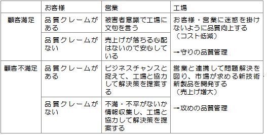 | しかし、そんな受け身の営業が面白いでしょうか? それ以前に、それを営業活動と考えているとしたら、どのようにしてお客様の信頼を得るのでしょう。お客様の求める品質やコストは工場任せです。自ら努力することと言えば、せいぜい接待を繰り返して、馴染みになることくらいでしょうか。 お客様が何に興味を持ち、何を求めているか? この情報をいち早くとらえて、開発や工場に伝え、ニーズに応えていく・・・営業マンが信頼を勝ち得るのは、まさにこのような活動を通してです。 さて、品質管理では、右を向いても左を見てもCS・顧客満足の花盛り。当然、品質クレームなど論外で、お客様が不満を持たないように品質を管理しなければならないという話になります。 普通、品質クレームをチャンスだと思うような営業マンはいません。しかし、もし創造性あふれる営業マンなら、ここで発想を変えて欲しい。品質クレームは「何を求めているか」の裏返しです。不良、不具合で困っているという思いは、それを何とかして欲しいという強いニーズです。 営業が本当に目を向けるべきなのは顧客満足より顧客の不満です。 顧客満足ではなくて顧客不満足!!! ・・・エライ先生からお叱りを受けそうなスローガンです。 |