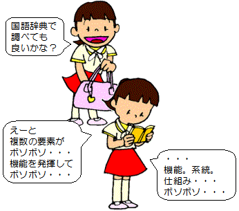 | 「構成部分の集まりで、それらの構成部分が互いに制約し合いながら、 一定の関係を保ちつつ統合され一体となって、機能を果たすもの」 |