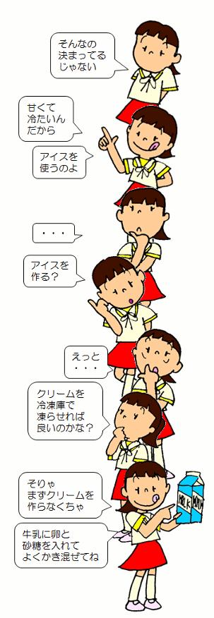 7.機能を展開する ところで、チョレートサンデーの機能を 甘くて冷たくて美味しい栄養をくれるっていうことにすると 甘くて冷たくて美味しくするためには どうしたら良いんだろう? そうですね アイスクリームを入れますね。 じゃ アイスクリームを入れるためには どうしなくちゃいけないかな? オーケー じゃ アイスを作るためには? クリームがなくちゃ 凍らせられないよ。 どうする? そう こんなふうに機能を目的にして そのための手段を考えると 目的と手段がつながっていきます。 これを機能展開って言います。 |