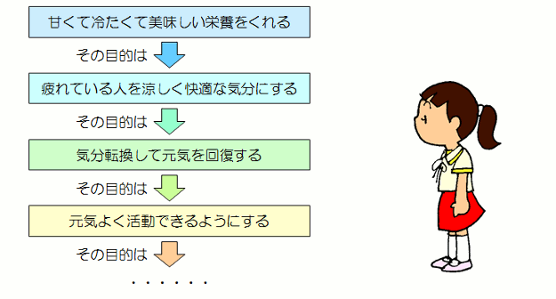という具合です。 こんな風に、機能の手段を追っていくことを、機能の下方展開と言います。 5.でお話したように 目的のシステムとその手段のシステムとは、システムのレベルが違います。 だから、下方展開があれば、上方展開もあります。 こちらは機能の上位機能、つまり目的の目的を追っていくやり方です。 例えばチョレートサンデーの機能 甘くて冷たくて美味しい栄養をくれる その目的はなんだろう? そんなに一足飛びに結論まで行かないで もう少し細かく考えられないかな? 例えば・・・ |